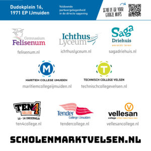 Kom dan op woensdag 12 november tussen 17.00 en 20.00 uur naar Bibliotheek Velsen in IJmuiden (Dudokplein 16). Je kunt daar kennismaken met alle middelbare scholen in de gemeente Velsen: Gymnasium Felisenum, Ichthus Lyceum, Maritiem College IJmuiden, Saga Driehuis, Technisch College Velsen, Ten4 College, Tender College IJmuiden en het Vellesan College.